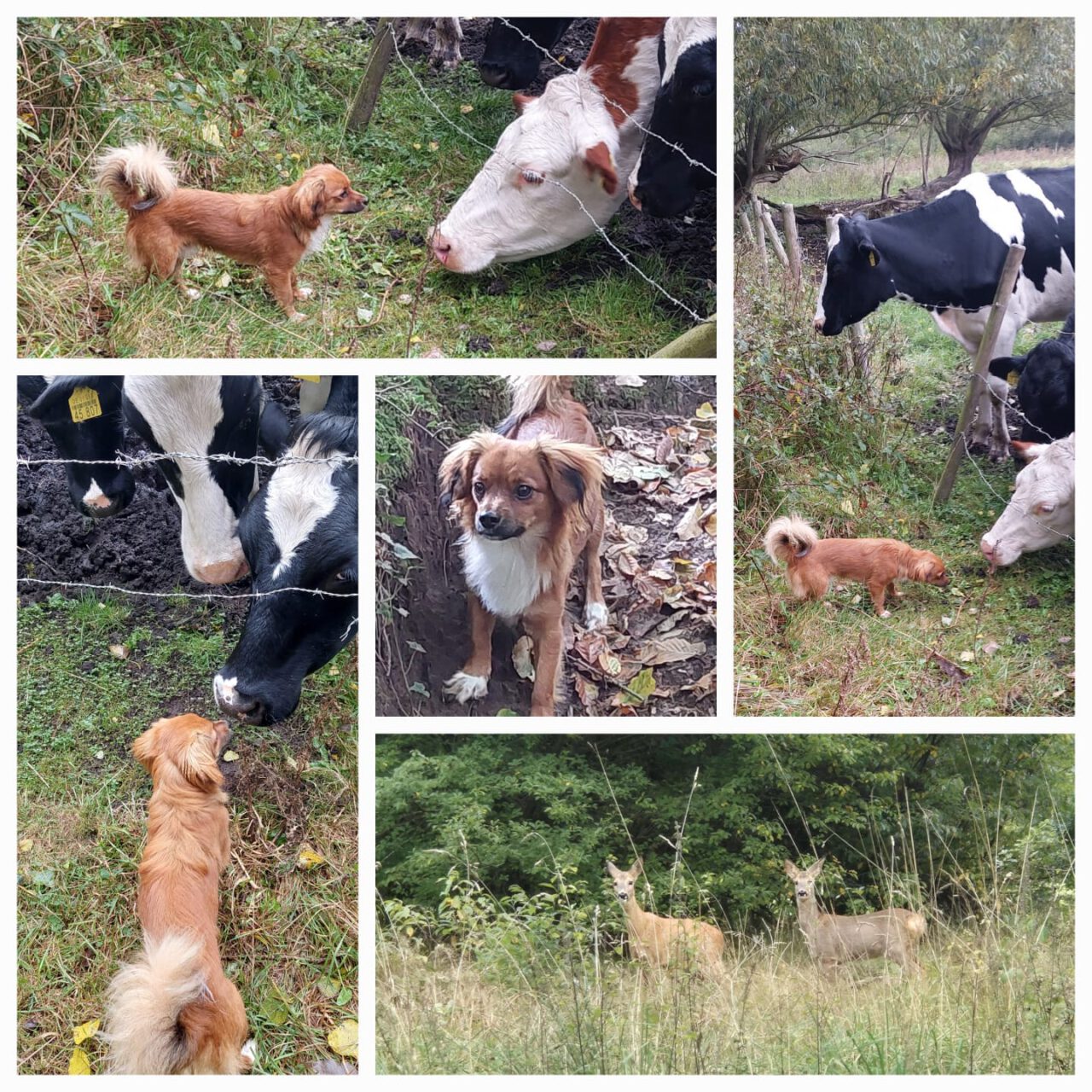 Der kleine freche Monty trifft im Hochmoor auf Matthias Kühe. Das Interesse ist beiderseitig. Und die Rehe schauen aus der Ferne interessiert zu.