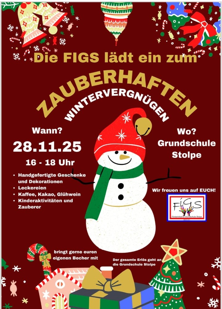 Am Freitag, den 28. November 2025 findet nun wieder das „Zauberhafte Wintervergnügen“ von 16 – 18 Uhr in den Räumen der Grundschule statt.