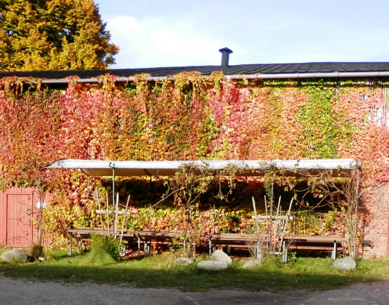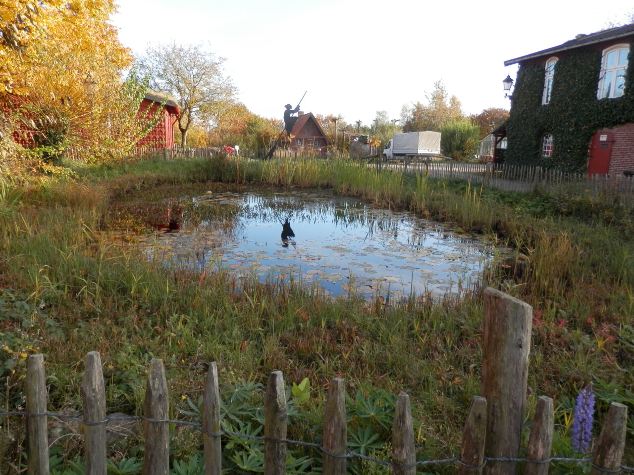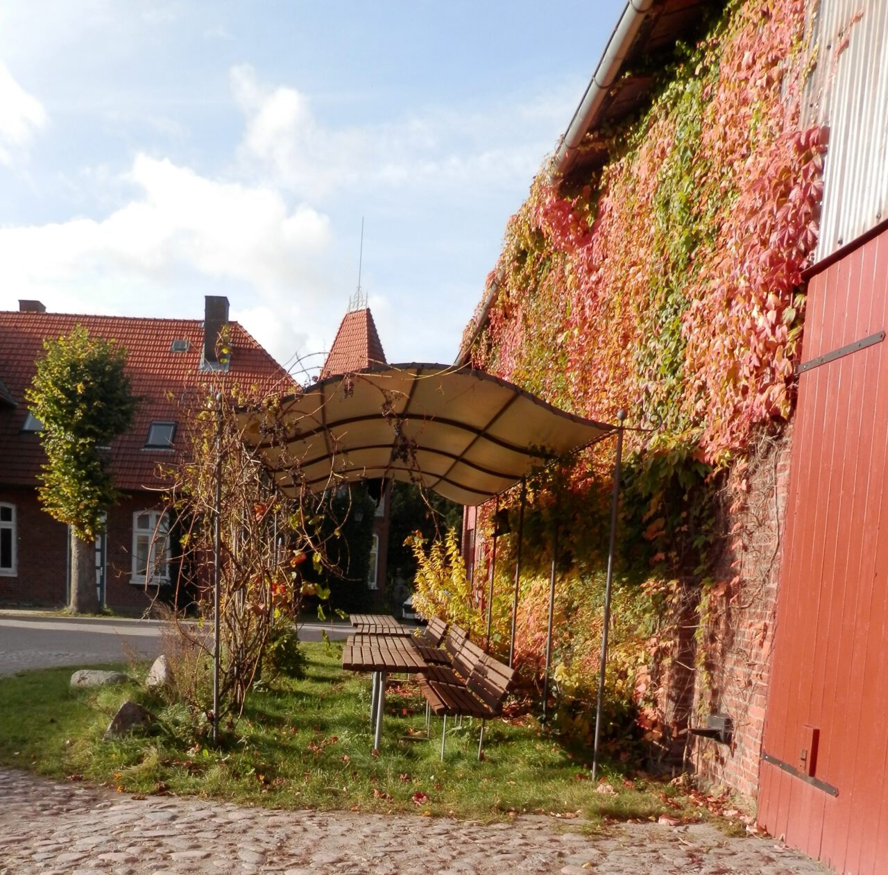 Herbstlicher Spaziergang im Kräuterpark – 2015 Das alte Wohnhaus mit Kopflinden Die alte Linde am Kräuterpark Mahlstein im Herbstlaub des Wilden Weins Der Hofteich Der Hofteich mit Kräuterhexe und Spiegelbild Die Backsteinscheune mit Wildem Wein und überdachten Sitzplätzen Idyllische Sitzplätze unter einem geschwungenen Metalldach Alter Mühlstein versteckt unter Bäumen Daneben der Tanzplatz Vogelhäuschen mit Dachbegrünung am Hofteich
