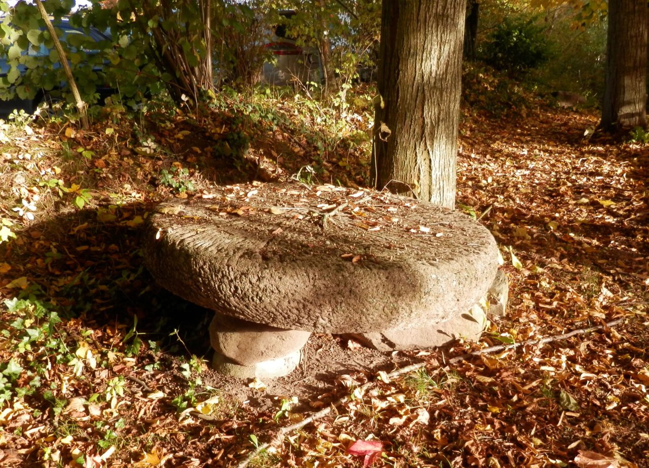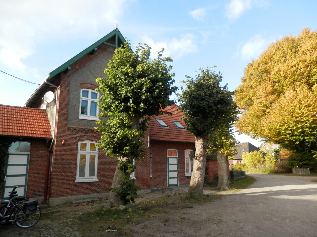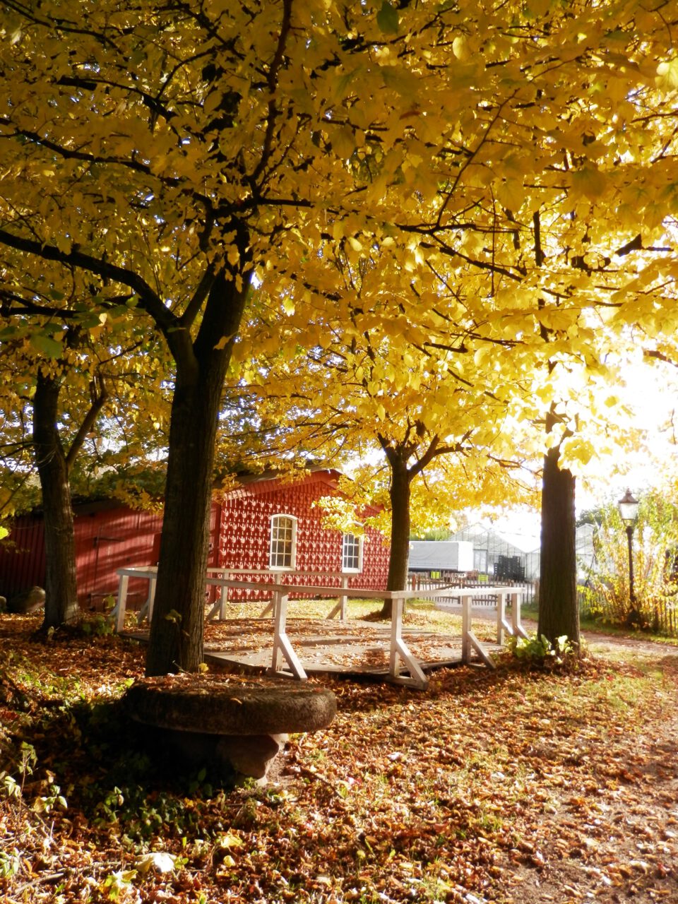 Herbstlicher Spaziergang im Kräuterpark – 2015 Das alte Wohnhaus mit Kopflinden Die alte Linde am Kräuterpark Mahlstein im Herbstlaub des Wilden Weins Der Hofteich Der Hofteich mit Kräuterhexe und Spiegelbild Die Backsteinscheune mit Wildem Wein und überdachten Sitzplätzen Idyllische Sitzplätze unter einem geschwungenen Metalldach Alter Mühlstein versteckt unter Bäumen Daneben der Tanzplatz Vogelhäuschen mit Dachbegrünung am Hofteich