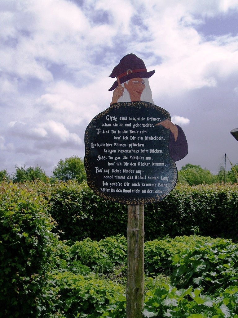 Auf dem Weg in den Botanischen Garten stand auf der rechten Seite vom Weg eine Kräuterhexe aus Holz mit gereimten Benimmregeln für den Kräuterpark. Schon ein bisschen crazy!