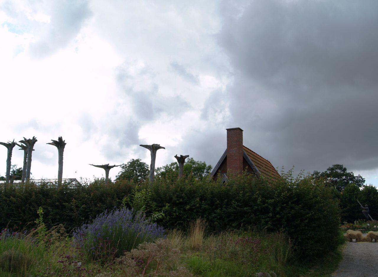 Die Baumskulpturen unter grauen Regenwolken