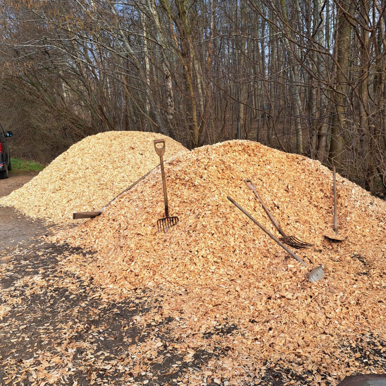Es ging hauptsächlich darum Hackschnitzel auf die Wege auszubringen. Angesichts der an den Vortagen gelieferten 20 Kubikmeter gingen wir alle davon aus, diese nicht verarbeiten zu können.