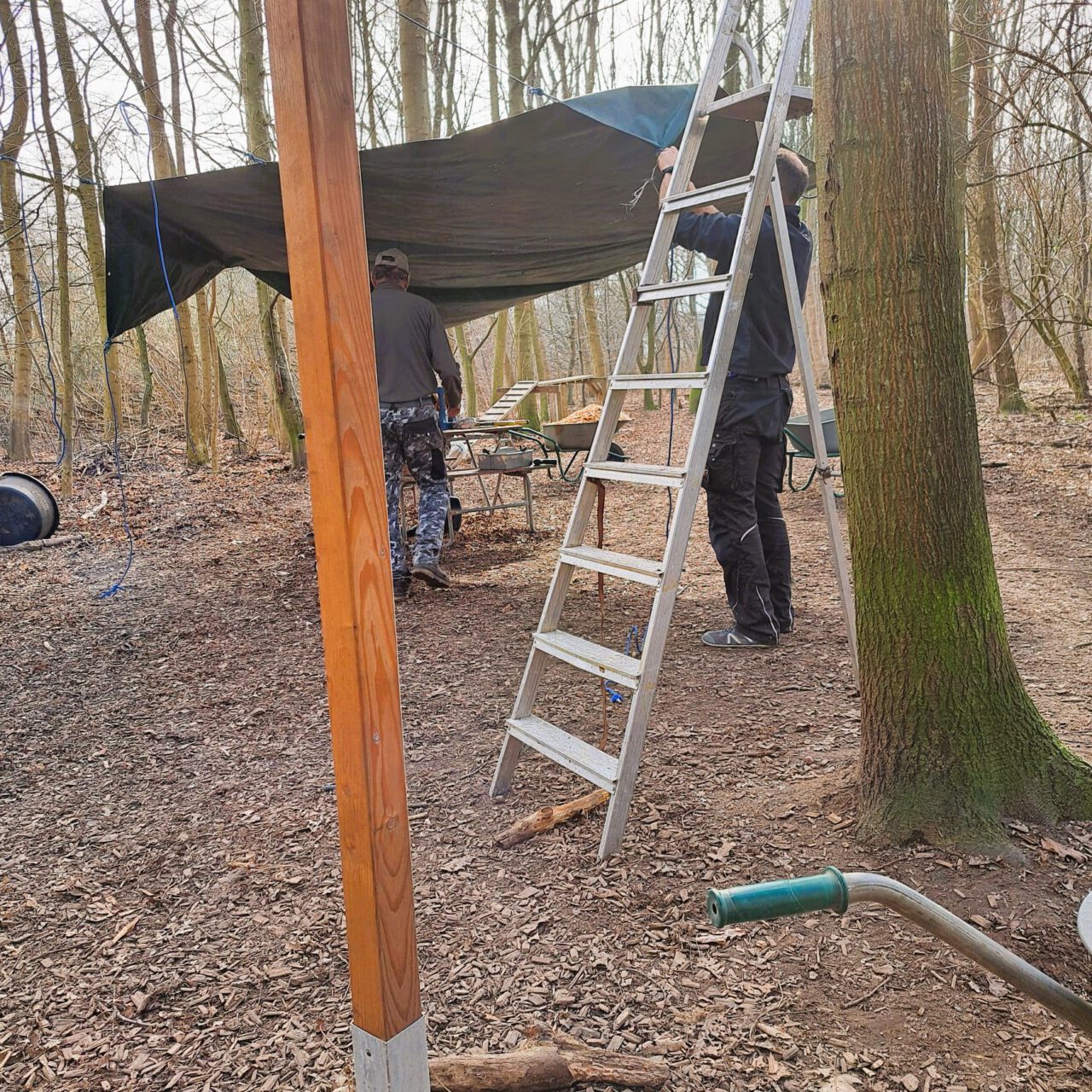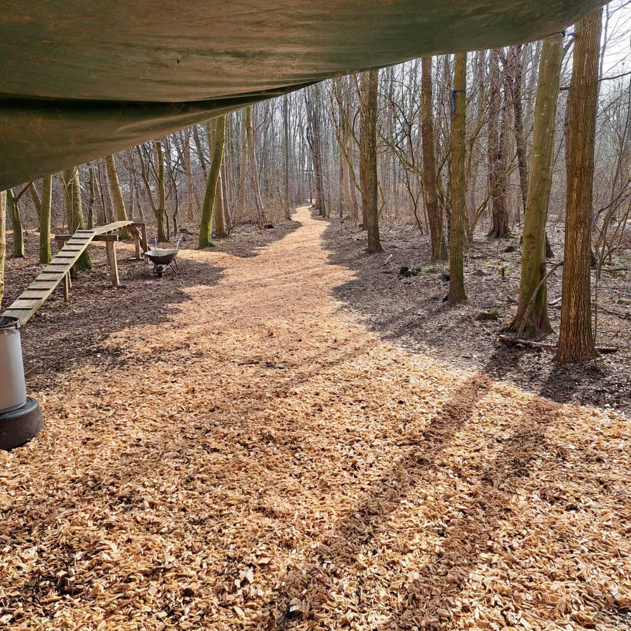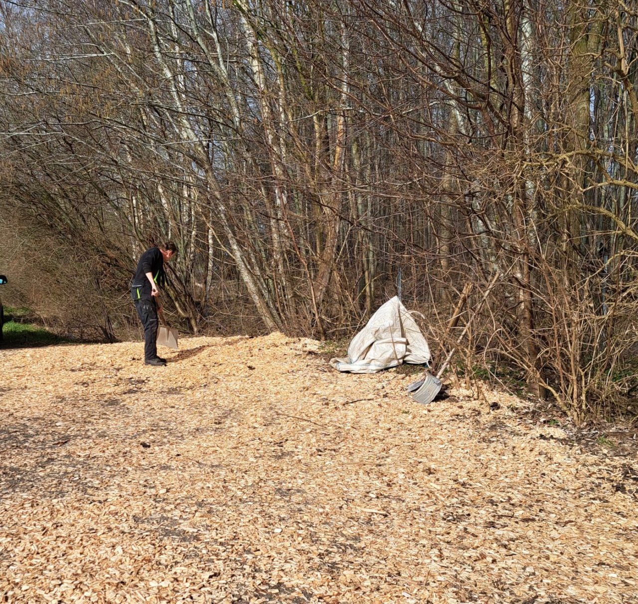 Um 11.30 Uhr waren dann aber schon etwas mehr als 10 Kubikmeter verteilt. Schubkarre um Schubkarre, ein kleiner Muldenkipper fuhren bis dahin stetig durch den Wald.