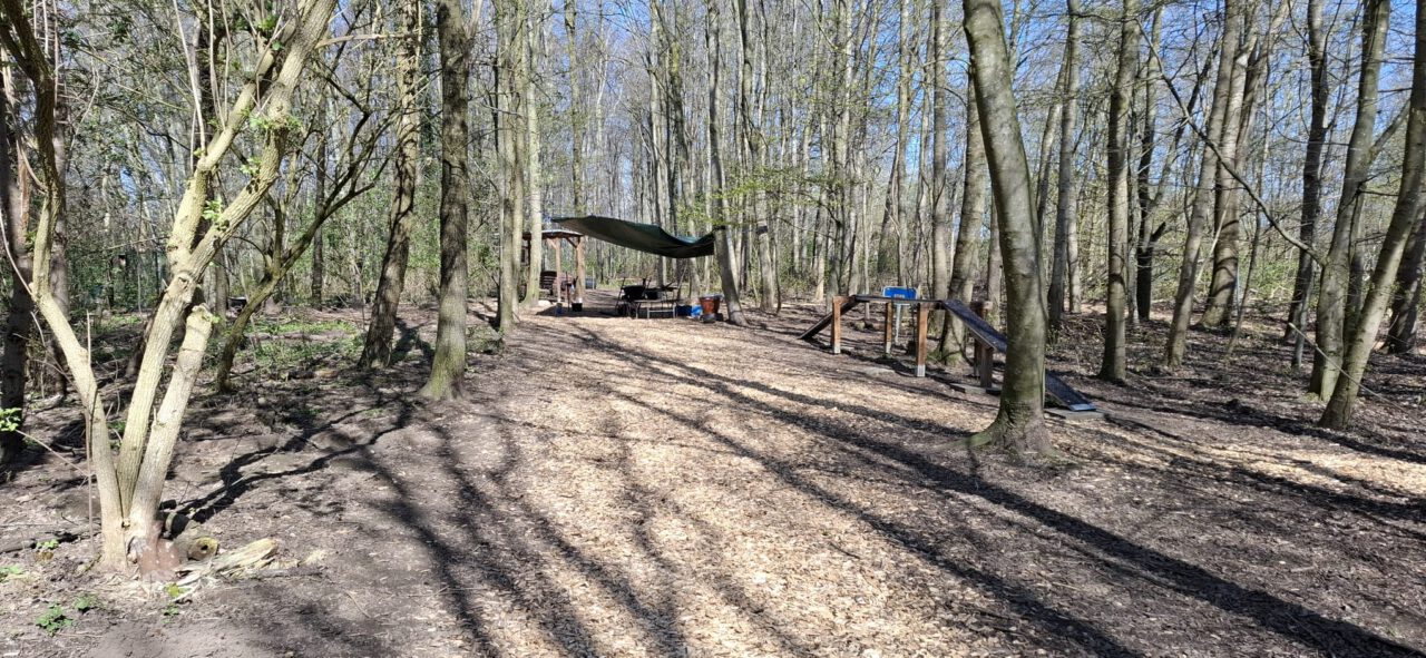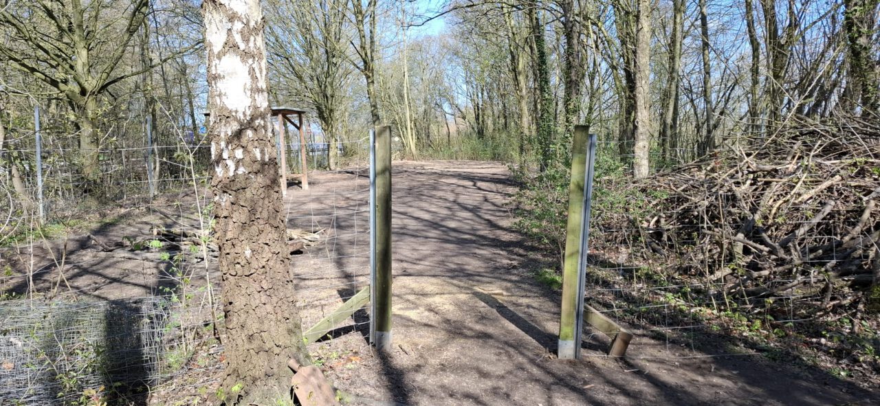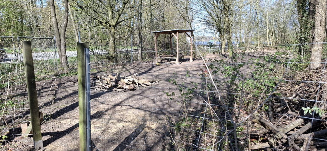 Andere Helfer haben den Trennzaun zwischen Sandfläche und Hauptwald errichtet. Die Pforte kommt noch.