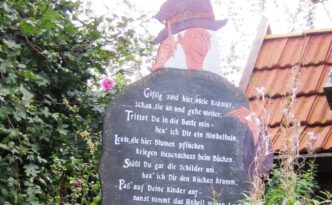 Auf dem Weg in den Botanischen Garten stand auf der rechten Seite vom Weg eine Kräuterhexe aus Holz mit gereimten Benimmregeln für …